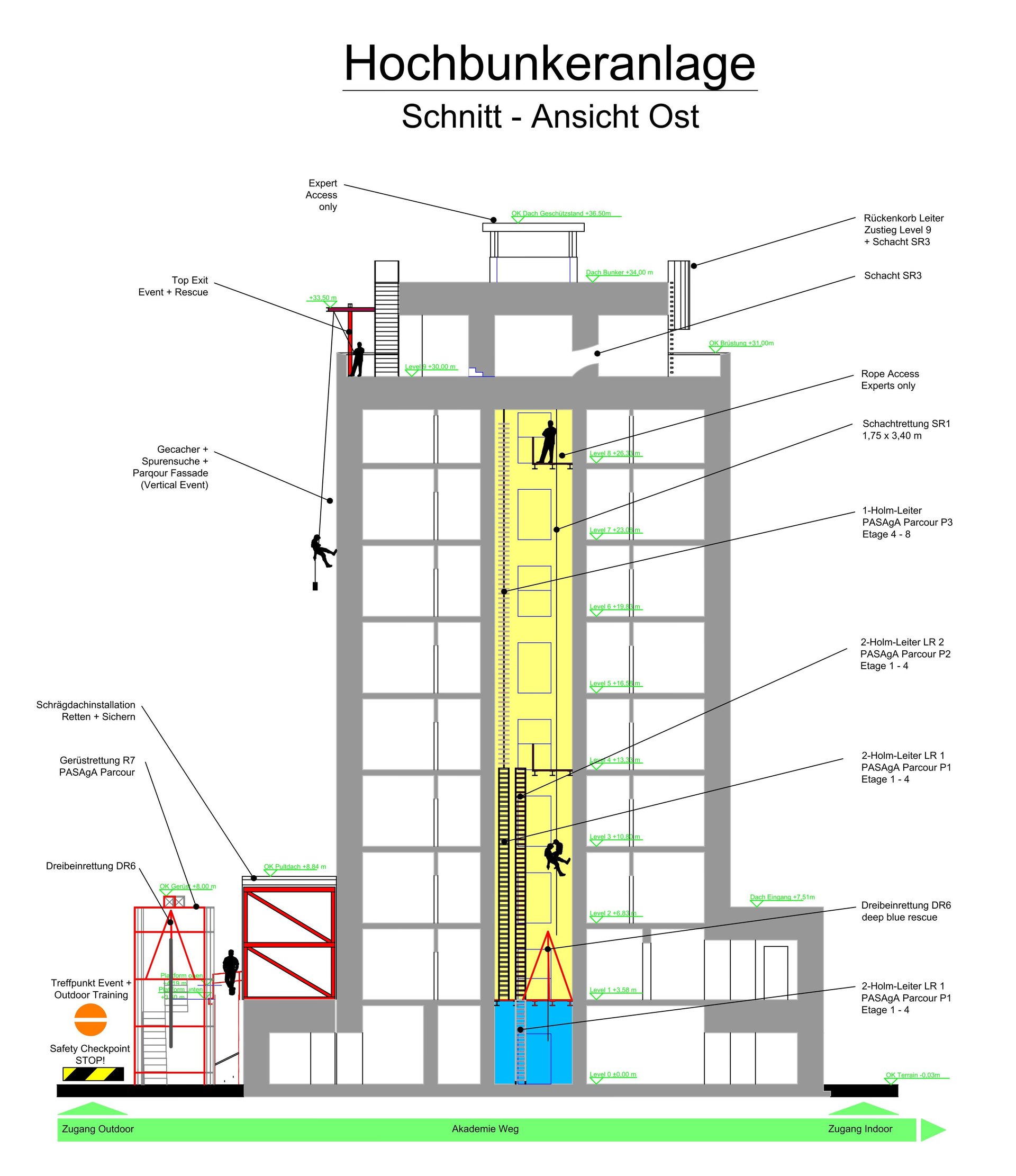 1,2 m - 3 m dicke Betonwände, Decken und die Fundamentplatte auf insgesamt 9 Etagen ergeben stolze 14.382.508,00 Kg Betonmasse. Dierse nahezu geniale Trainingssubstanz aus Lüftungsschächten, Zwickel, Anbauten, sowie eine Vielfalt an Nutzungsmöglichkeiten bieten hervorragende statische Ressourcen und Befestigungseigenschaften für eine professionelle Bühne im Bereich "Höhe" und "Event". Der Eigentümer Jost Organista, selbst Höhentechniker und Höhenretter, beschließt Mitte 2018, dem 75 Jahre alten verstaubten Koloss noch einmal eine Chance zu geben und diesen wieder in den Dienst der Sicherheit zu stellen.